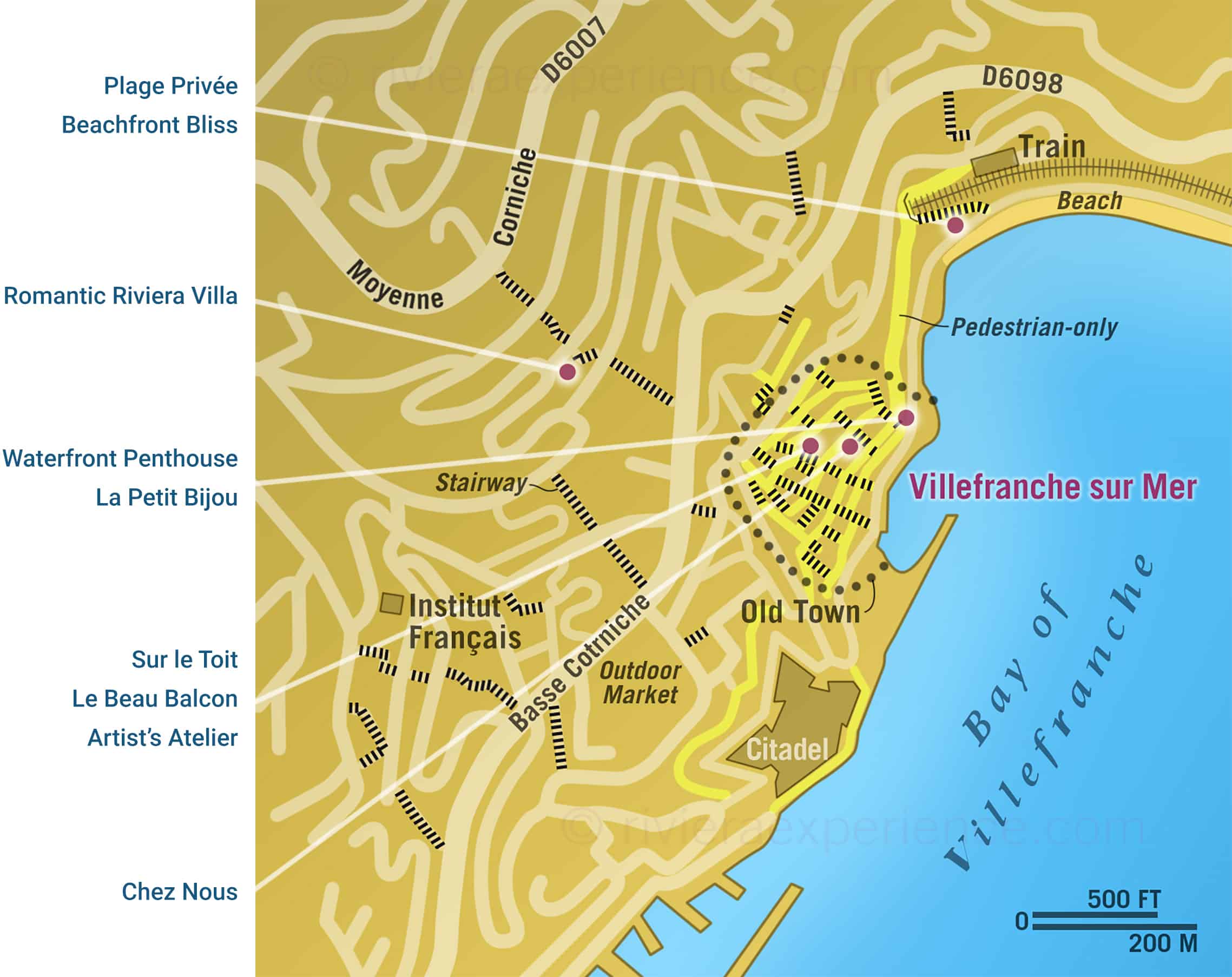 From the map you can see how close and well positioned Villefranche is to everything along the Riviera: the beautiful Port and Old Town of Nice is just a few kilometers away (and a lovely walk if you would like), while Monaco and the Italian border aren’t much farther (easy by bus or train). Going just a little farther brings you to historic Antibes, chic Juan les Pins, and glamorous Cannes (all easy train rides from Villefranche), while the famous art village of St. Paul de Vence and the perfumiers of Grasse are just beyond (and both reachable by bus). You won’t need a car to enjoy all these places as our bus and train public transport is excellent and inexpensive — and often faster and easier than driving.
